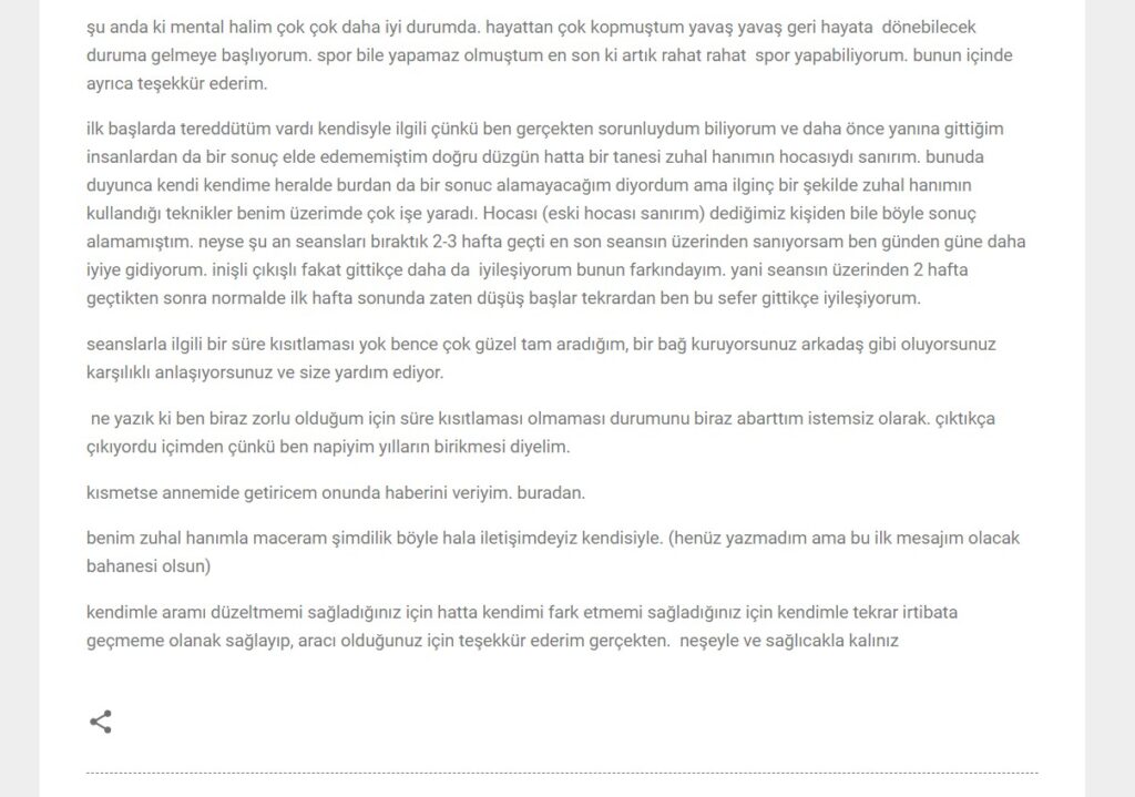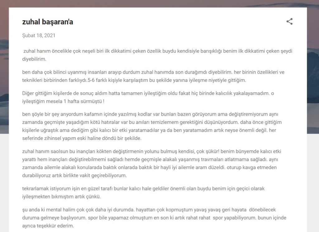 Zuhal hanım’ın seansları bana her defasında kendimi çok iyi hissettirmiştir. Aile dramasını ise tecrübe etmeyen kaldıysa çok çok tavsiye ediyorum. Aile draması insanın kendi içine yaptığı değişik bir yolculuk, tarif etmek mümkün değil; mutlaka denemelisiniz :). İnsan kendine bile itiraf edemediği cümleleri kurarken buluyor kendini, ya da bilinçaltının çok derinlerine sakladığı anıları tekrar yaşıyor. Seans sonunda kendinizi çok rahatlamış, kendiniz ve hayat ile sorunlarınızı aşmış olarak buluyorsunuz. Farklı kişilerin aile dramasında kodlanma tecrübesi de yaşadım, gerçekten çok değişik bir ruh hali. Birdenbire kodlandığınız kişinin ruh haline bürünmek anlatılmaz yaşanır. Bir kez yaşadığınızda tekrarını sabırsızlıkla bekleyeceksiniz ☺️